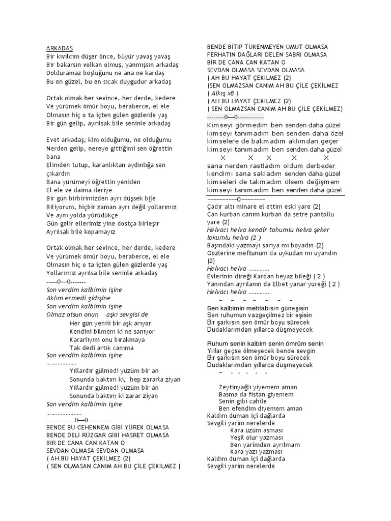 Bir şarkısın sen ömür boyu sürecek. Ruhum senin kalbim senin ömrüm senin yıllar geçse ölmeyecek bende sevgin bir şarkısın sen ömür boyu sürecek dudaklarımdan yıllarca düşmeyecek. Yıllar geçse ölmeyecek bende sevgin. Sen kalbimin mehtâbısın güneşisin sen rûhumun vazgeçilmez bir eşisin.